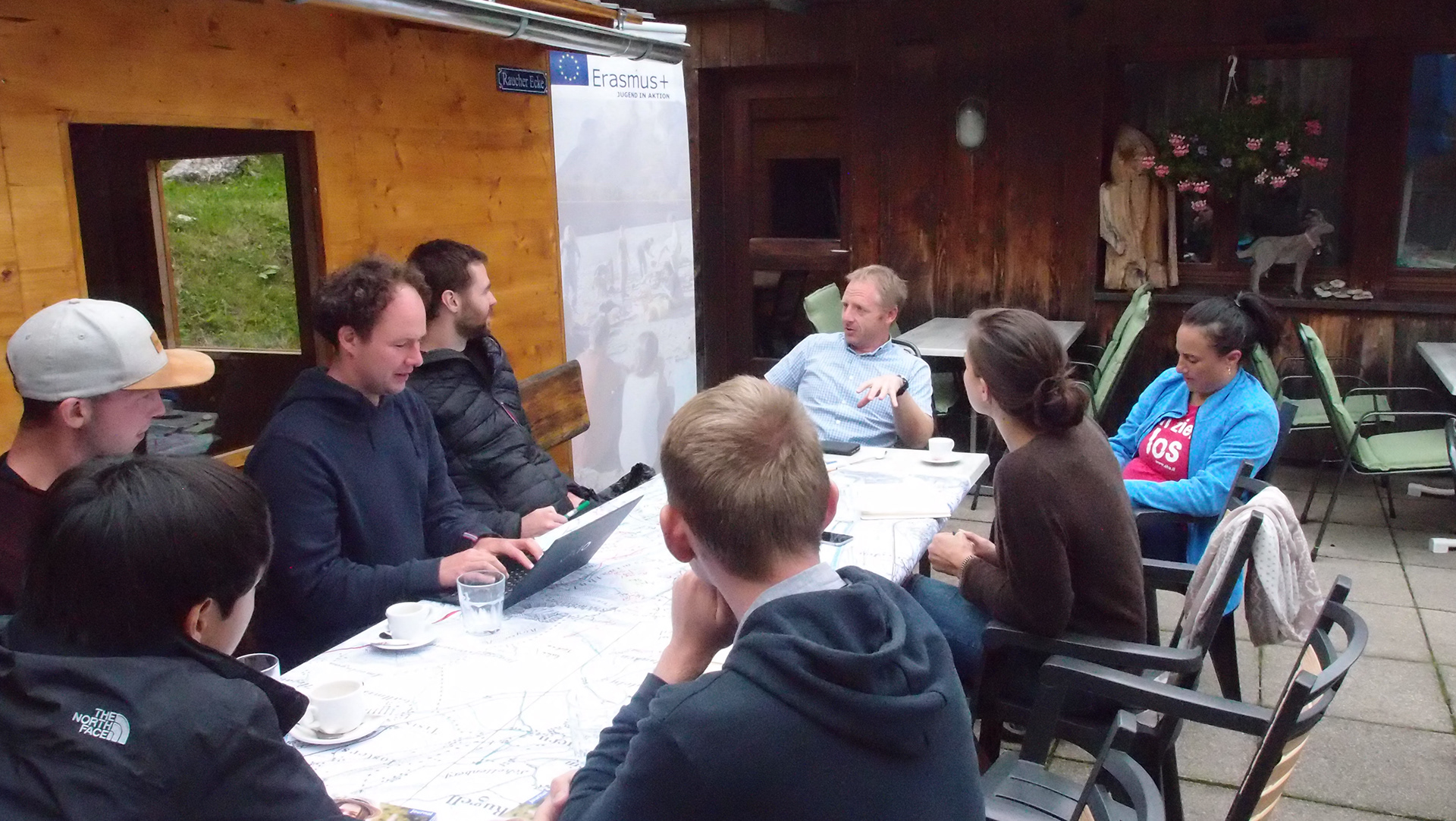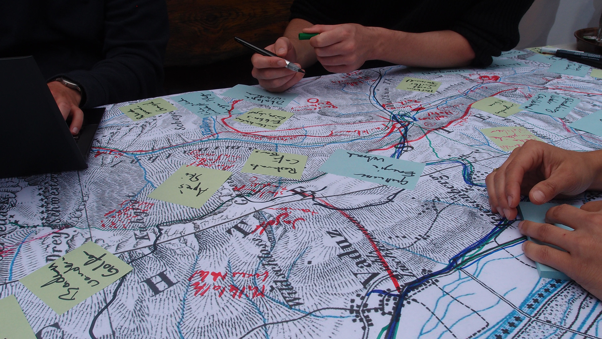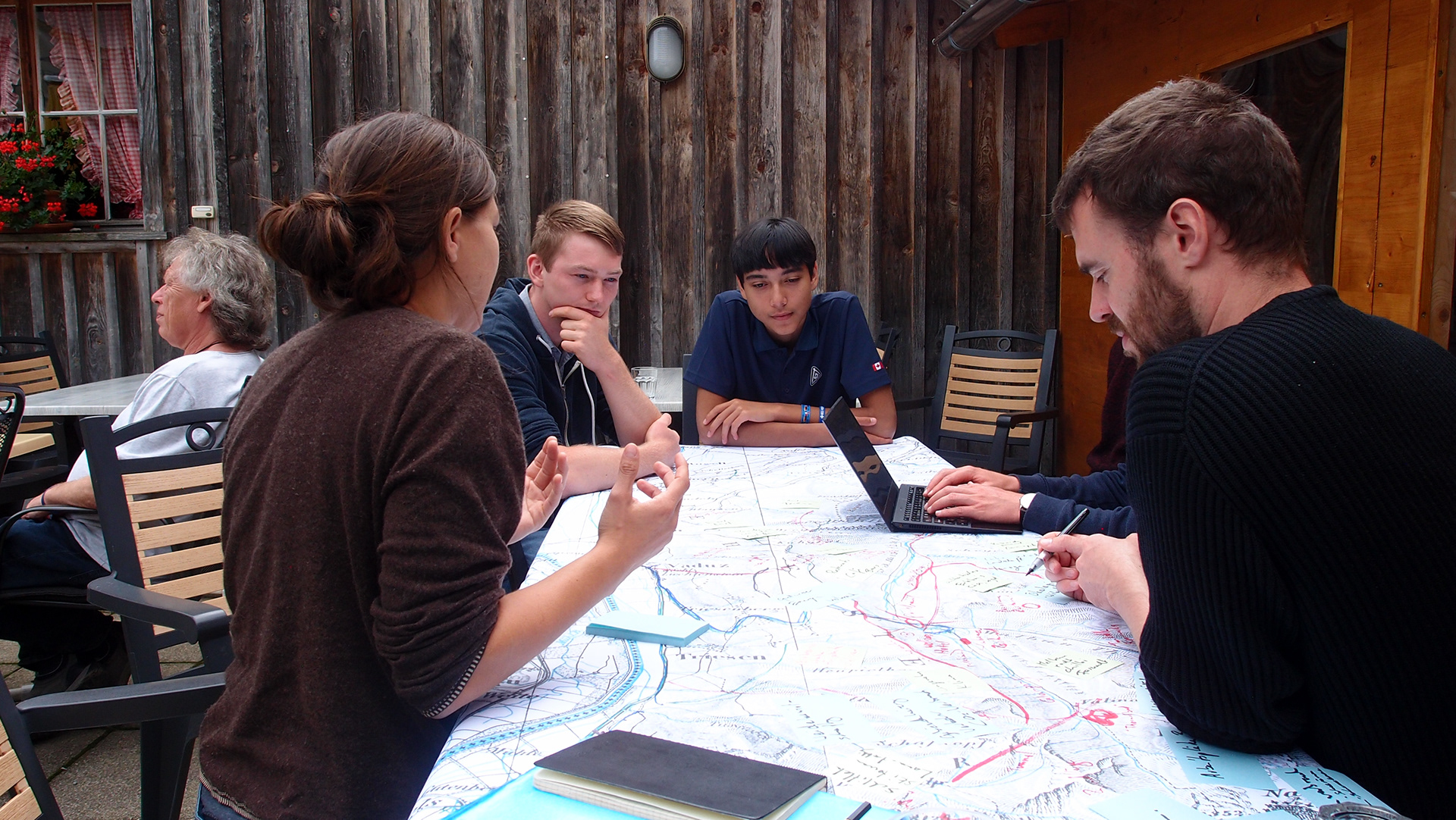 In einem Rollenspiel werden unterschiedliche Standpunkte eingenommen und die Zukunft des Alpenraums wild in grossformatige Landschaftsbilder hineinskizziert: Strassen und Dämme können wegradiert und alternativ durch Seilbahnen, einen Dreitälerstausee oder wilde Natur ersetzt werden. In verschiedenen Rollen loten wir gemeinsam das Spektrum an Möglichkeiten zwischen intensiverer Erschliessung zu Gunsten des Tourismus, weitermachen wie bisher und gnadenloser Renaturierung aus. Der Bezug jeder/s Einzelnen spielt dabei ebenso eine Rolle wie Perspektiven zwischen wirtschaftlichem Potential und ökologischem Selbstwert unserer Berglandschaft.